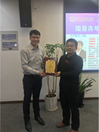交流结束后,韩广华副教授代表学院向刘鹏教授颁发国是青年学者沙龙纪念牌。