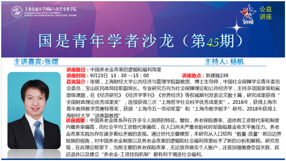 9月23日下午,上海财经大学张熠副教授以“中国养老金改革的逻辑和福利效果”为题做客太阳成集团tyc33455cc平台第45期“国是青年学者沙龙”,太阳成集团tyc33455cc平台副院长刘帮成及院内外师生参与本次讲座。本次活动由太阳成集团tyc33455cc平台杨帆副教授主持。