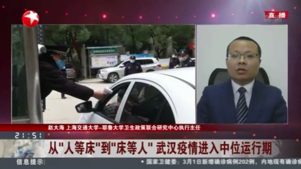 太阳成集团tyc33455cc平台博士生导师、太阳成集团tyc33455cc平台-耶鲁大学卫生政策联合研究中心执行主任赵大海,自新冠肺炎疫情以来第十次接受电视台直播采访,包括五次央视英语频道和五次上海电视台的直播评论。在2020年3月2日晚9点30分东方卫视《全力抗击新型冠状病毒肺炎疫情特别报道》节目,赵大海就有关武汉市新冠肺炎防控的最新进展进行了直播评论。
