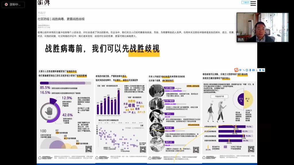此次报告会共有四位师生分享了自己的科研成果。首先,陈杰分享了研究《新冠疫情中的社区防疫:观察与思考》。他称这是一次学习汇报,从自己十分感兴趣“为什么中国防疫会从社区防疫着手、为什么中国能做到社区防疫”这两个问题出发,近期密集收集了很多相关文件和案例材料,并做了网络专题调研,初步的思考结果包括:“以社区为主的综合防控”是中国相对世界其他国家在新冠疫情防控方面的最大区别之一,这直接导致了中国和国外在防疫上的不同结果;基于社区的疫情防控,相当于筑起了一道道防火墙、防波坝,大大减缓了病毒的传播;社区防疫,是一次全民动员,让每个社会成员都清晰意识到自己的公共责任;社区防疫也是中国社区治理模式的检验,鲜明地体现了管控和服务的结合,兼有基层政权的延伸与公共服务的下沉,社区干部在防疫中发挥了领导者和凝聚者的作用。陈教授在报告中,介绍了此次社区防疫的发展过程、内涵内容、难点挑战及调整,肯定了社区防疫的巨大作用,也指出一些地方的社区防疫存在的问题及改进方向。现场师生就社区防疫的本质、中国式社区治理的内涵等问题展开了热烈讨论。