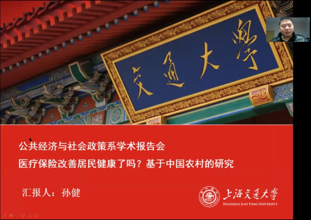 博士生孙健汇报了论文《医疗保险改善与居民健康——基于中国农村的研究》,该论文运用倾向得分匹配的方法分析了医疗保险对农村居民的影响,发现新农合显著改善了居民的自评健康和心理健康,对于身体健康的影响并不显著,新农合健康效应存在显著的年龄、收入差异,新农合通过提高居民医疗卫生服务利用率、改变居民医疗机构的选择来改善健康状况。现场师生对内生性问题、事后道德风险、健康权等问题进行了讨论。