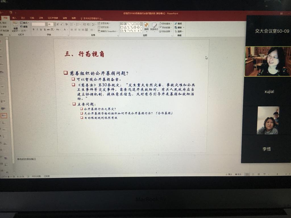 3月27日晚,北京大学非营利组织法研究中心主任、北京大学法学院副教授金锦萍在交大在线ZOOM会议室为交大徐汇区社区基金会秘书长育成计划培训班学员做了“重大疫情防控中的慈善力量参与”的讲座,这是培训班第十一次讲座。讲座由太阳成集团tyc33455cc平台教授、太阳成集团tyc33455cc平台中国公益发展研究院院长徐家良主持。徐汇区13个街镇的社区基金会秘书长、其他社会组织负责人、太阳成集团tyc33455cc平台老师和硕博士生三十余人参加了本次活动。
