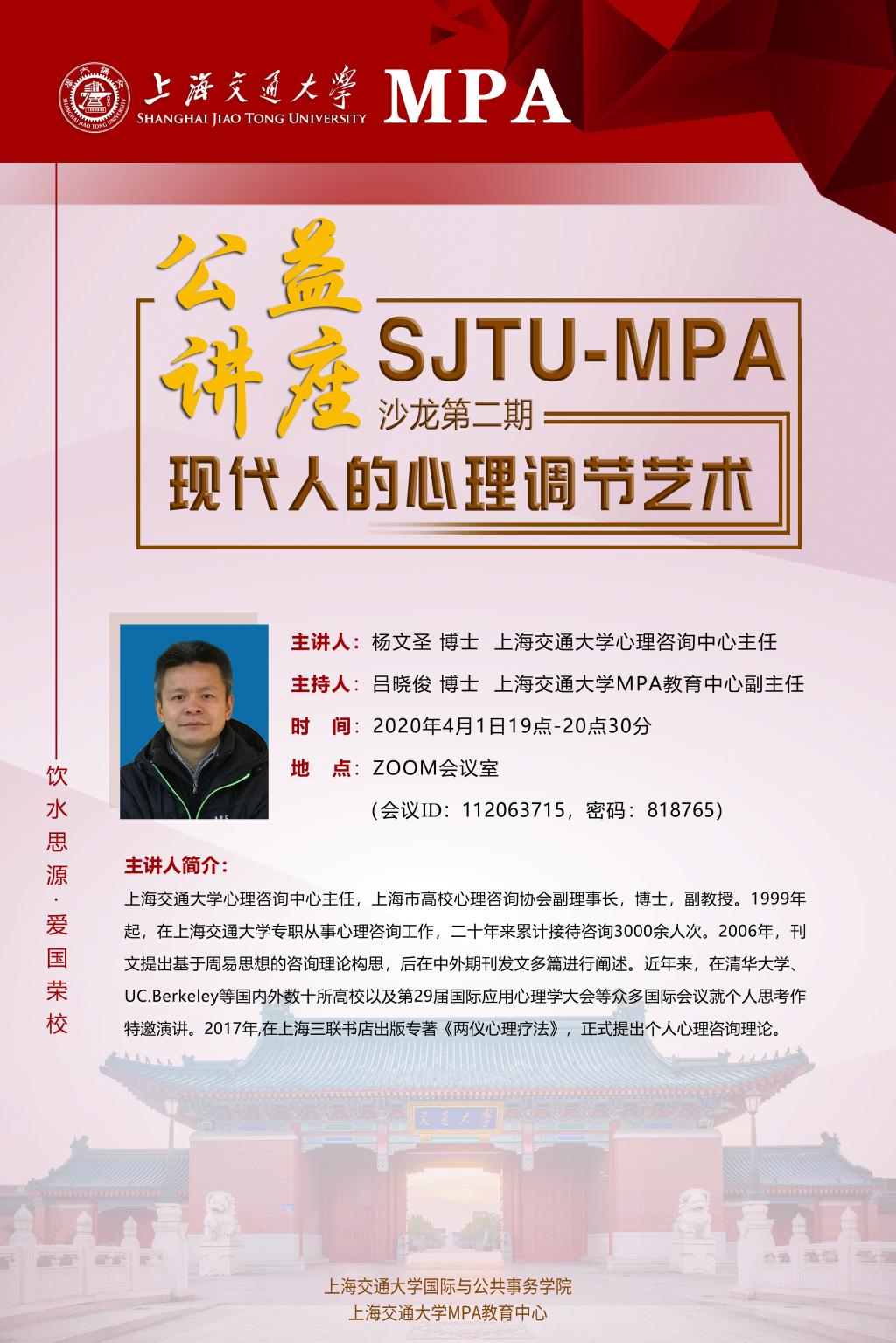 太阳成集团tyc33455cc平台公益讲座暨SJTU-MPA沙龙第二期:现代人的心理调节艺术