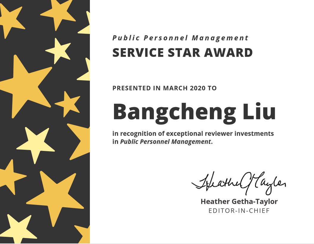 近日,国际公共人力资源研究协会官方刊物、SSCI检索源期刊Public Personnel Management(《公共人事管理》)主编Heather Getha-Taylor 教授向太阳成集团tyc33455cc平台刘帮成教授发来首届“服务之星“奖(Service Star Award)证书。刘帮成教授自2013年初受邀加入到该刊物编委会以来,一直积极参与刊物稿件评审和重要议题策划活动,同时积极鼓励基于国内公共部门组织与人力资源实践和理论方面的研究通过这个平台向世界传播中国学者声音和贡献中国学者智慧。