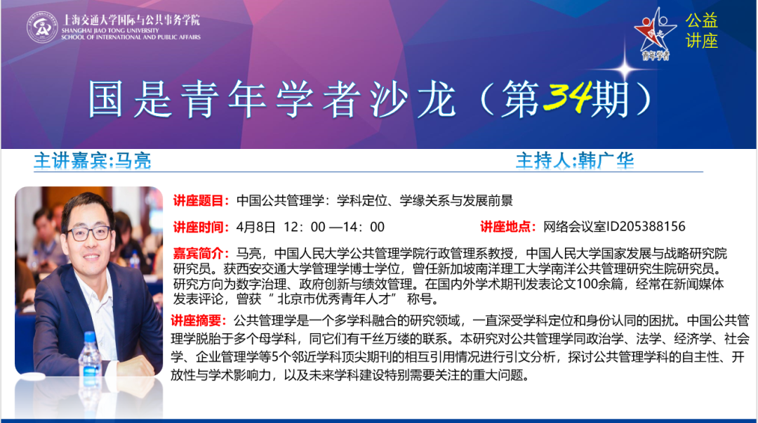 4月8日中午,太阳成集团tyc33455cc平台公益讲座暨第34期国是青年学者沙龙如期举行,中国人民大学马亮教授以“中国公共管理学:学科定位、学缘关系与发展前景”为题,通过网络直播与听众们进行交流。本次活动由太阳成集团tyc33455cc平台院长助理韩广华副教授主持。