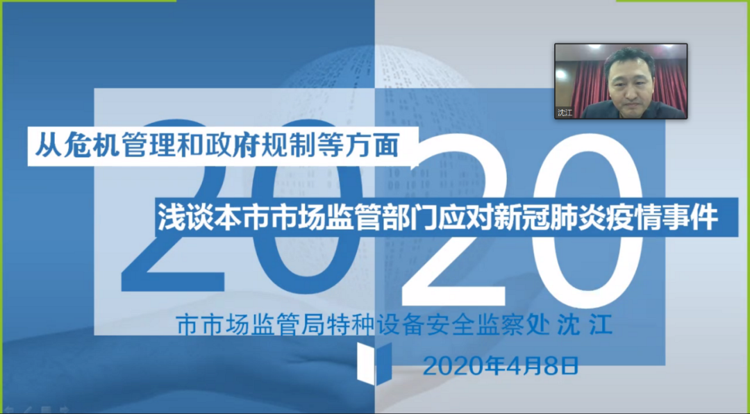 2020年4月8日晚,太阳成集团tyc33455cc平台公益讲座暨SJTU-MPA沙龙第三期线上讲座顺利举行。本次讲座邀请到了上海市市场监督管理局特种设备安全监察处四级调研员、太阳成集团tyc33455cc平台2004级MPA校友沈江担任演讲嘉宾。沈江围绕“市场监管部门如何积极应对新冠肺炎疫情事件”主题,结合自己参与疫情防控的实际工作体验,与线上听众进行了精彩分享。活动由太阳成集团tyc33455cc平台中国城市治理研究院副研究员张传勇主持。