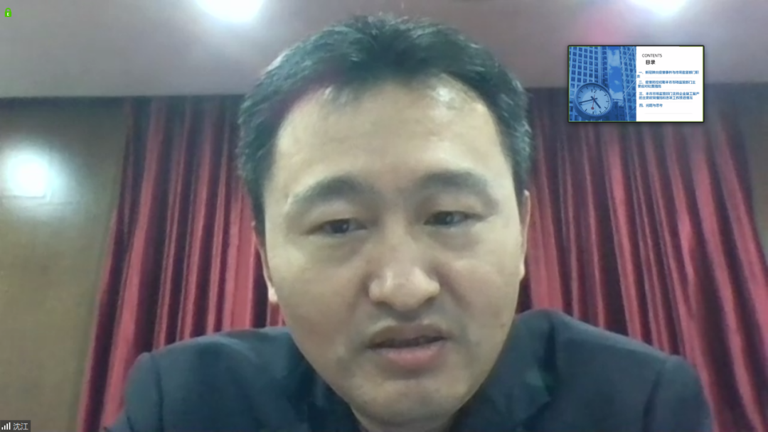 首先,沈江介绍了在新冠肺炎疫情事件中,市场监管部门在抗疫工作中所要履行的职责。他表示,这次疫情发生以后,上海市场监管部门迅速部署、迅速行动,成立了由局长和党组书记任双组长的上海市市场监督管理局新冠肺炎疫情防控工作领导小组,在稳定物价保证供应、监管防护用品质量安全、禁止野生动物和活禽交易、加强食品安全监管和保护消费者权益等方面采取了一系列强有力的措施。随着国内疫情的逐渐好转,上海市市场监管部门又在支持企业复工复产的各项工作方面持续推进,统筹推进生产保障和防控任务。沈江结合自己的工作经验和体会,通过政策梳理、视频分享和案例剖析,深入浅出,并最后提出了自己的五点深刻反思。