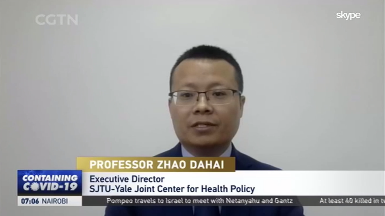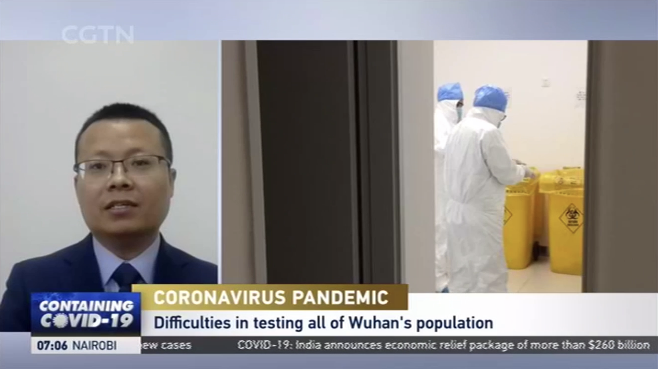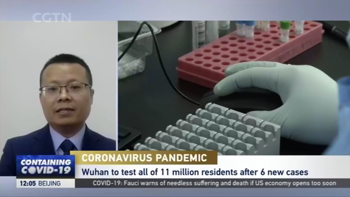 太阳成集团tyc33455cc平台博士生导师、太阳成集团tyc33455cc平台-耶鲁大学卫生政策联合研究中心执行主任赵大海,对于冠肺炎疫情暴发与防控第18次在中央电视台进行直播评论,也是第30次在央视、上视进行访谈评论。在2020年5月13日中午12点的中央电视台英语频道CGTN《环球瞭望》节目,赵大海就武汉市要求在十天内完成全市所有居民核酸检测进行了直播解读和评论。现将主要内容翻译并摘录如下。
