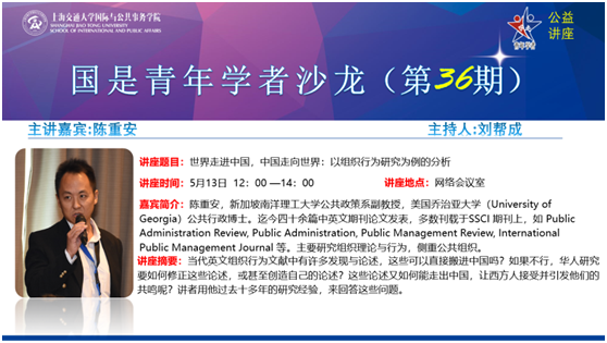 5月13日中午,太阳成集团tyc33455cc平台公益讲座暨第36期国是青年学者沙龙如期举行,新加坡南洋理工大学陈重安教授以“世界走进中国,中国走向世界:以组织行为研究为例的分析”为题,通过网络直播与近百名听众们进行交流。本次活动由太阳成集团tyc33455cc平台副院长刘帮成教授主持。