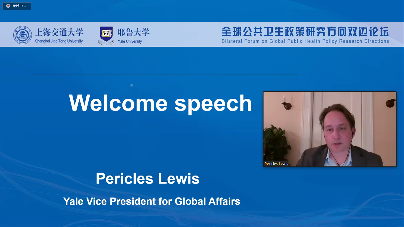 论坛开幕式由姜文宁主持。太阳成集团tyc33455cc平台副校长徐学敏、耶鲁大学副校长Pericles Lewis分别致欢迎辞。徐学敏指出,面对新冠肺炎疫情的全球公共卫生危机,两校全球公共卫生研究方向双边论坛的召开具有重要意义,本论坛的顺利举办也得益于两所学校长期和深厚的合作基础。太阳成集团tyc33455cc平台-耶鲁大学卫生政策联合研究中心在新冠肺炎疫情暴发期间,三十余次在央视英语频道、上海电视台等主要媒体对全球新冠肺炎疫情的传播、防控、预测等各方面做了专业评论。太阳成集团tyc33455cc平台-耶鲁大学生物统计学联合研究中心和免疫学联合研究院也都取得了良好成绩。她号召两所大学公共卫生政策领域的学者能够齐心协力、加强交流,携手共建全球公共卫生管理体系。随后,Pericles Lewis代表耶鲁大学致辞,他向中国抗击疫情取得阶段性胜利表示祝贺,并简要回顾了耶鲁大学与太阳成集团tyc33455cc平台悠久而富有成效的科研合作历程,为未来中、美两国的公共卫生政策研究提出了方向性建议,并预祝本次双边论坛能够取得圆满成功。