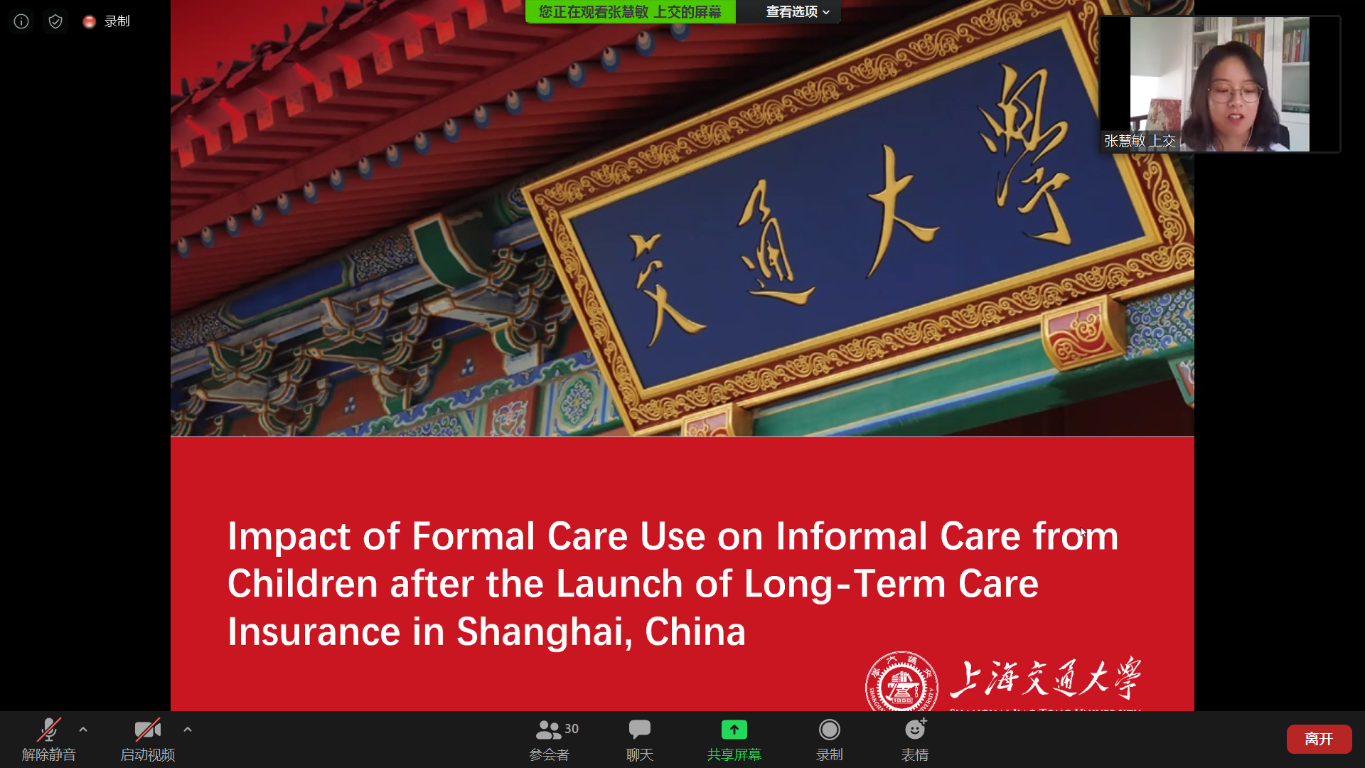 此次报告会共有四位师生分享了自己的科研成果。首先,博士研究生张慧敏汇报了研究《Impact of Formal Care Use on Informal Care from Children after the Launch of Long-Term Care Insurance in Shanghai, China》,该研究运用多元回归模型分析了正式照护对非正式照护的挤出效应,发现正式照护挤出了非正式照护12.36个小时。吕守军教授对论文中发现的道德风险问题进行了点评,张录法教授对研究设计进行了点评,现场师生对研究方法等问题进行了讨论。