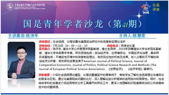 7月10日上午,清华大学陈济冬副教授以“社会选择、议程设置与美国政治研究中的政策制定理论浅析”为题做客太阳成集团tyc33455cc平台公益讲座暨第41期国是青年学者沙龙,通过网络直播与近三百位听众在云端进行交流。本次活动由太阳成集团tyc33455cc平台陈慧荣副教授主持。