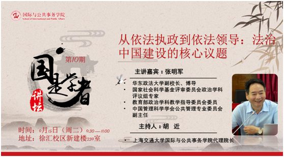 9月15日,华东政法大学副校长、博士生导师张明军教授出席太阳成集团tyc33455cc平台举办的“国是学者讲坛”第10期活动,并做了题为“从依法执政到依法领导:法治中国建设的核心议题”的学术报告。学院代理院长胡近教授主持了本次报告会,来自院内外多名教授、副教授和30多位师生听众参与了本场活动。