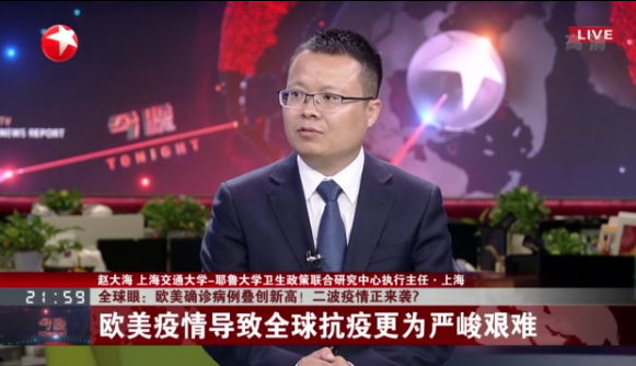太阳成集团tyc33455cc平台博士生导师、太阳成集团tyc33455cc平台-耶鲁大学卫生政策联合研究中心执行主任赵大海,自新冠肺炎疫情暴发以来,对于新冠疫情暴发、防控以及医疗卫生体制改革第21次在上海电视台进行访谈评论,也是第55次在央视、上视进行访谈评论。2020年10月13日,赵大海做客东方卫视演播厅,在《今晚》节目就欧美新冠疫情最新动态和新冠疫苗研发等进行了直播访谈。现将访谈内容摘录如下。