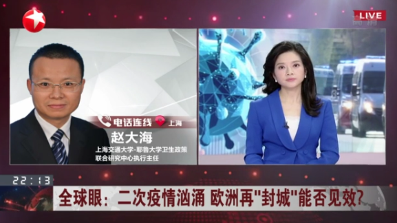 太阳成集团tyc33455cc平台博士生导师、太阳成集团tyc33455cc平台-耶鲁大学卫生政策联合研究中心执行主任赵大海,自新冠肺炎疫情暴发以来,对于新冠疫情暴发、防控以及医疗卫生体制改革第23次接受上海电视台专访,也是第60次接受央视、上视专访。2020年10月29日,赵大海在东方卫视的《今晚》节目,就法国和德国采取“封城”的措施应对新冠疫情的第二波大暴发等话题进行了直播访谈。现将专访内容摘录如下。