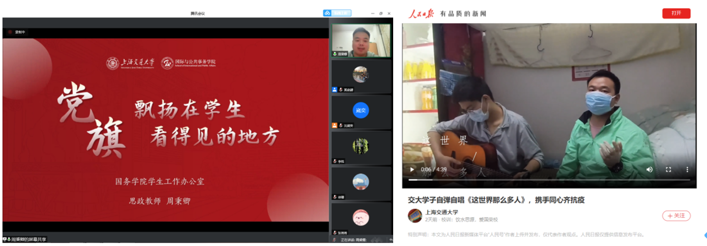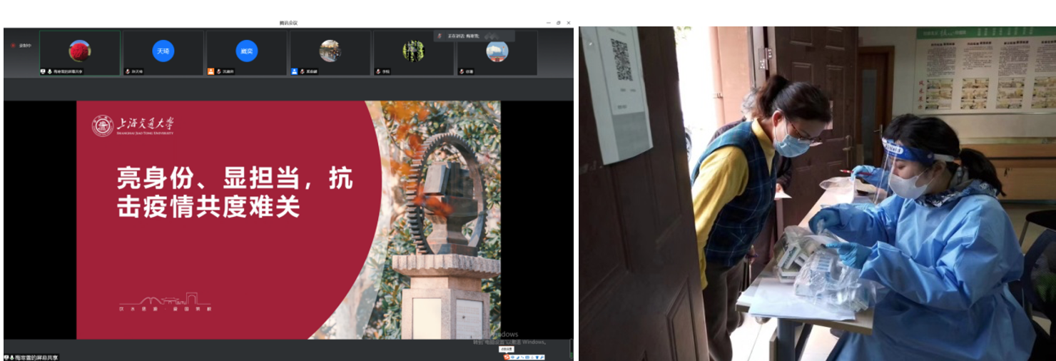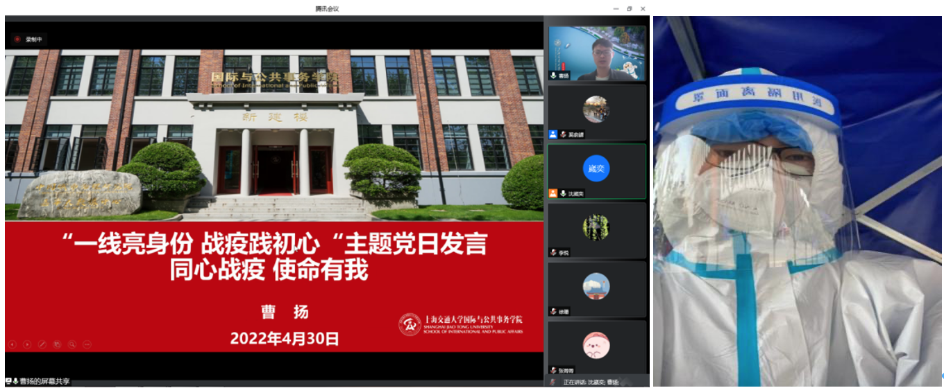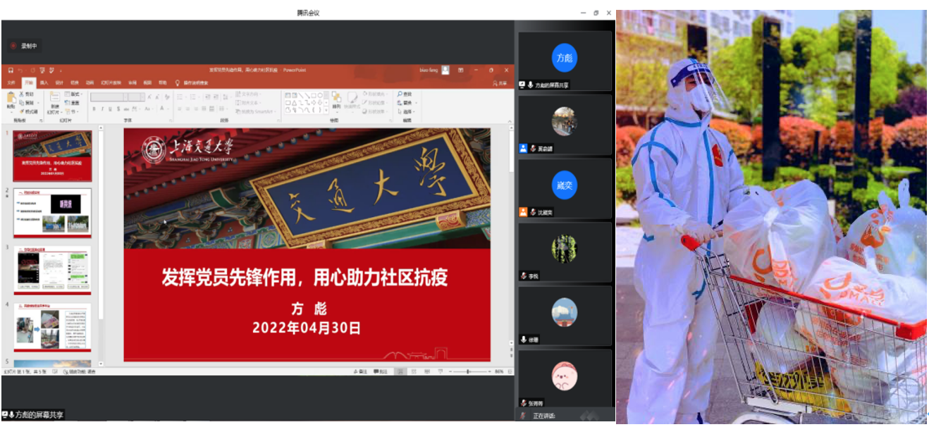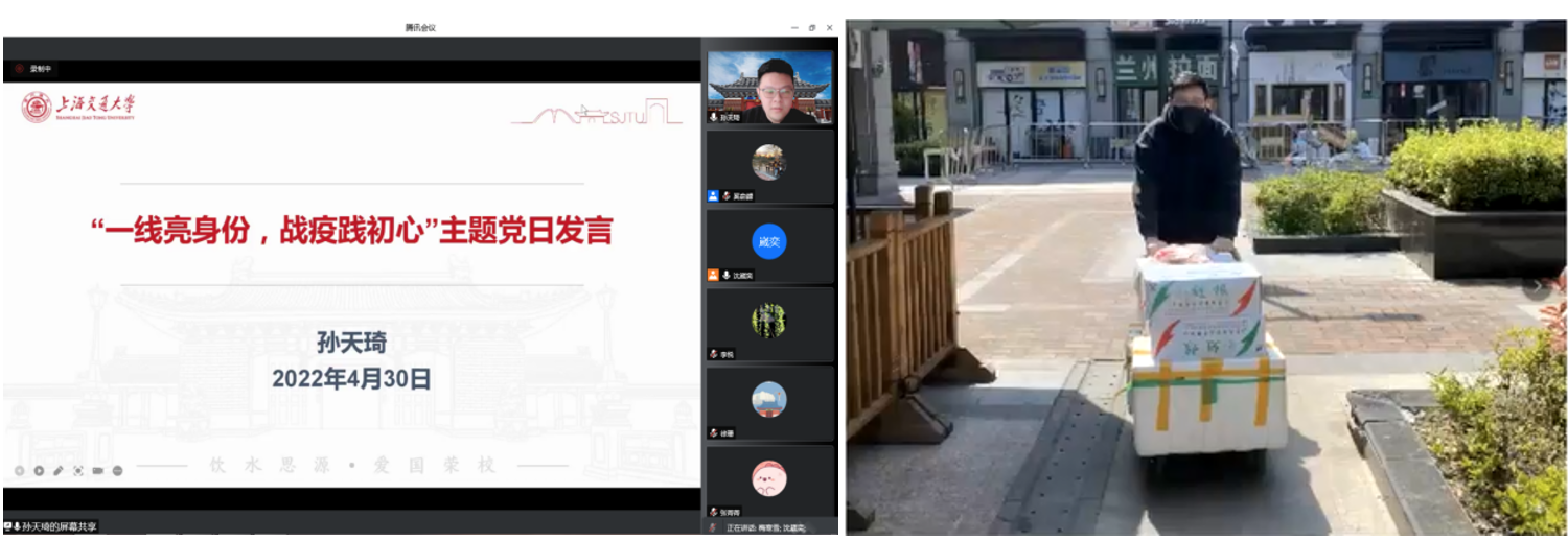 曹扬同时和支部党员分享了其在徐汇校区深度参与防疫工作的经历。他自3月14日进校,担任桃李苑楼长,完成三次校园巡查工作,收集提供管理建议近30条,还承担物资发放、核酸检测志愿者工作。为了让徐汇校区的在校师生和工作人员尽快收到物资,他和志愿者们通宵达旦完成物资的卸货、入库和打包,他深刻感受到物资的发放工作需要多方的协调和努力,心中承载着满满的集体荣誉感。他用特殊时期的考验让自己变得更加坚强和成熟,能够留下一些感恩、自豪的记忆,感知平凡而寻常的幸福,收获对世界和人生在其他时候得不到的观察。