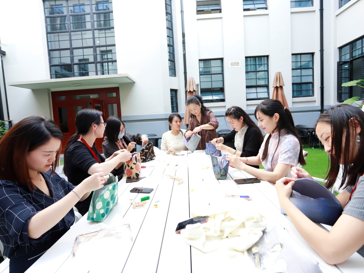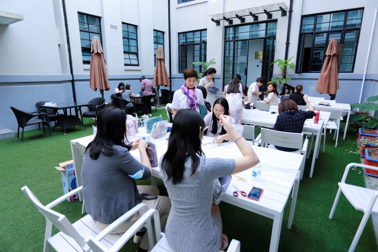 活动特邀资深培训师彭世红现场讲授口金包制作技巧并示范,参与的老师们现场穿针走线,互相借鉴,在指导老师的帮助下,一个个精美的中式口金包在大家的手中陆续诞生。在摄影师的镜头下,女教师们纷纷持包拍照留念,在学院的教工小院里留下金秋最美的交大倩影!